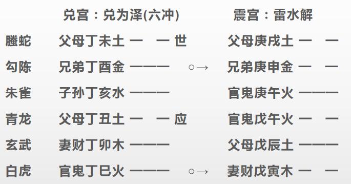 例如酉月辛卯日占拜见贵人求财,得到兑为泽卦,变为雷水解卦∶