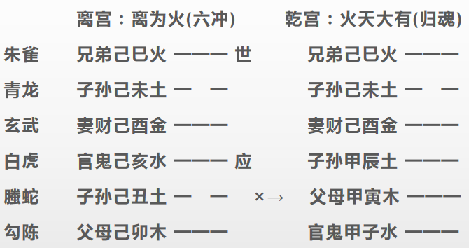 请伊母再占一卦,得离之大有。母占子,子孙为用神。丑土子孙虽逢月建,不宜动化寅木回头之克,目下无妨,交春木旺土衰,必死。又合前卦亥水世爻得申金原神相生,寅月冲去申金则危矣。果卒于交春之日。
