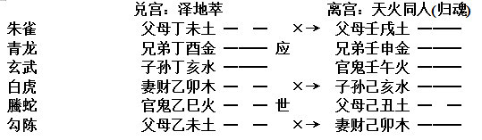 如卯月戊辰日占父亲的官司,已经拟议判为重罪,得到泽地萃卦,变为天火同人卦∶