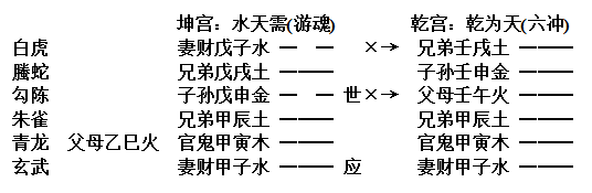 又如卯月癸亥日,新迁住宅,人口不安,占得水天需变乾卦。申金子孙持世,化午火回头之克,乃自身与子孙同受克也。上爻子水财动,又化土克,财为妻妾、婢仆,乃一家受害之象,速宜迁居。彼曰:“另改门户何如?”余曰:不能免也,回头克我,至夏季火旺,必遭凶厄。岂知彼之宅近黄河,卜后,日欲迁而不果。至午月,河决,一家九口,俱逐浪随波矣。夫应午月者,午火当权,克世克子,又冲子水妻财,所以全室罹害也。