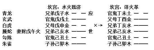 如辰月丙申日,占弟弟的痘症已经临危,得到既济卦,变为革卦∶