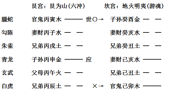 【原文】如寅月丁酉日占开铺面,得艮卦变明夷卦。世临寅木,得令当时,目下开张,即许热闹。独嫌日辰克世,世化回头之克,生少克多,又是六冲卦,六冲不久。彼曰“或是伙计不同心,或是别有他因”予曰“鬼在身边,须防疾病。伙伴从此变心,必受其累。”果于六月痢疾,至八月伙计盗尽,鸣之于官,分文不获。此谓之“当时旺相无伤,过时有害”。应六月者,木墓于未;伙计变心者,应爻申金秋天当令而冲世;财被盗尽者,子水财落空亡。