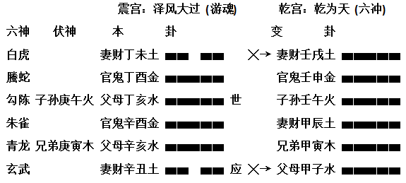 1994年2月26日,笔者亲戚从粤东老家来深圳,谈话间,她诉说最近胃部经常不适,服用胃仙u后稍安定。我劝她试作摇卦检测,自摇卦得《大过》之《乾》: