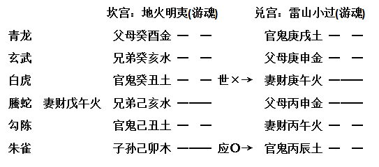 【原文】如申月丙子日占出门,得明夷之小过。世动被子日合住,必有事绊,不能动身。伊曰:“因何而阻?”予曰:“卦中子动变鬼,防儿女少安。”彼曰:“正因小女多病,男家催促成婚,今欲往外求取,以备妆奁。”予曰:“所得何病?”彼曰:“血枯成痨。”予曰:“卯木子孙,申月绝之,子日刑之,且又动而变鬼,恐嫁之不及矣!”
