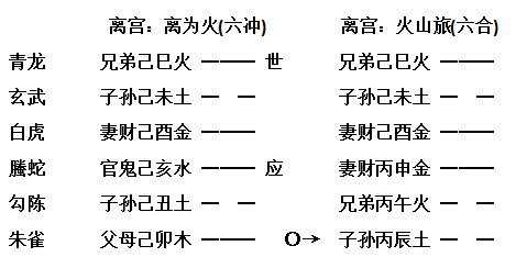 予又验其六冲卦变六合者,如未月丁巳日,占己悔婚还可成否,得离卦变火山旅。断曰:“此卦从来难以吉断。因得屡验六冲变合,散而复聚,离而必合,此婚一定还成。”果于次年三月仍复成婚。