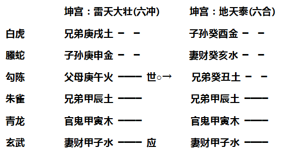 如亥月壬子日,占子遇害否,得雷天大壮变地天泰卦。此人之子,闻传言被人辱骂,赶去厮打,其父卜之。予曰:"六冲变六合,必有人劝解。父爻持世而克子,乃尔之责子也,不受他人之害。”少刻,果有人请去论理,其子理亏,父执棍而击之,亦被劝住。其父与子向众赔礼而回。然厮打不成者,乃六冲之变合也。父击子而被劝者,乃因日辰子水冲克世爻,不能以击子也。