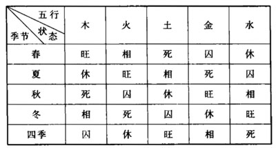 五行旺相休囚死是依据五行周游于四时(四季),故四时中金木水火土无时不有。由于四时变化,寒暖燥湿的不同,自然环境也发生旺衰起伏的变化,旺者由旺转衰,衰者由衰转旺,循环无穷,现将同时期旺衰五行列表如下:
