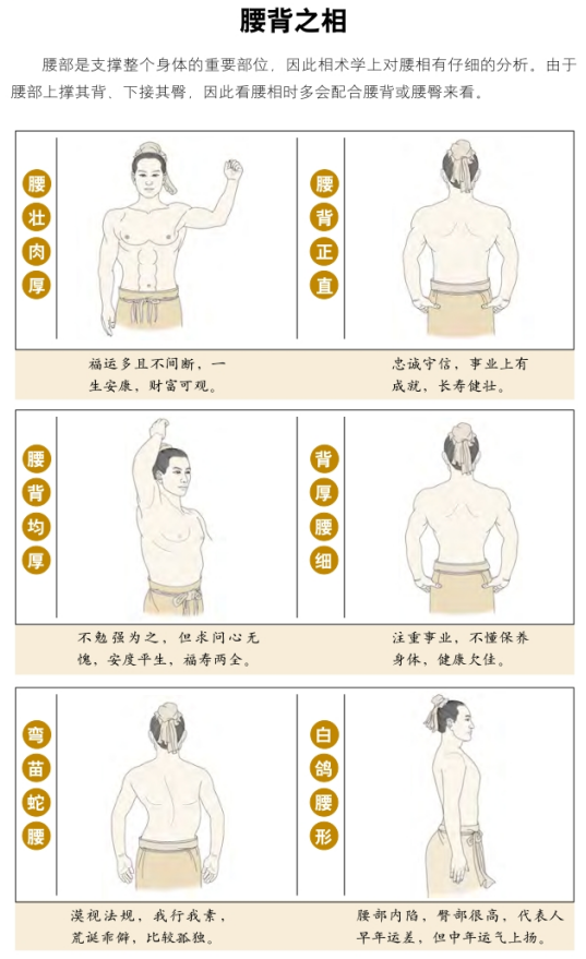 背部丰厚平阔,腰部圆隆挺直,为吉相。背脊凹陷成坑,背部较薄,肩膀下垂或者高耸,颈项较细,都为不吉之相。腰部圆隆厚实,粗大平整,臀部凸出厚实,胸部平整丰满,项下肌肉饱满下垂,呈双绦状(双绦指的是脖子的肌肉丰满,重叠下垂),腹部的形状好像葫芦,肚脐下面肌肉横生,皆为吉相;反之,腰部细小软弱,有弯曲,臀部瘦削尖耸,臀部过大,臀部外翘,胸骨粗大外露,心窝部位低陷,肚脐下面肌肉尖削,或者形状像鹊肚、狗肚,皆为不吉之相。