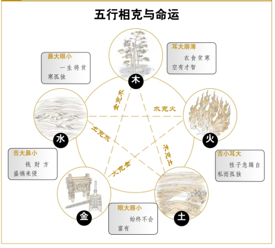 五行乃金木水火土,不可一大一小,不配不停,不周不合。左耳金星,右耳木星,额为火星,口为水星,鼻为土星。额高耳反(火克金),父母家财总是空,口大额尖(水克火),一交十五身受苦,口大睛清额又高,定是高贤大贵豪,鼻大口小(土克水),十三十四离乡间。五行有一克不为好相,得一生者大好。