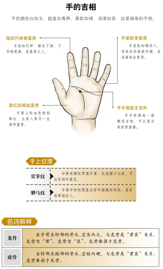 凡男女之手宜色润、指长、纹细,心背有肉为妙。离宫有井纹,当入翰林;乾宫起纹到离宫,为冲天纹,白手起家,掌心红润,数年内可起,纹若乱,则名利少成,纹浅,志亦浅,纹深志亦深。纹乱,心多乱,无纹心必愚,有纹为妙。大凡指长、掌厚、纹深、色明、血润,男为卿相,女为夫人。
