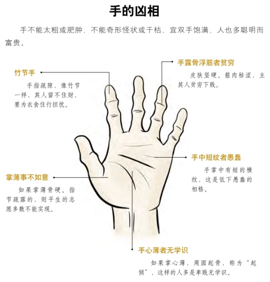 又云:指甲乃精之余。指甲厚,主人胆大,指细主人聪明,掌明则财兴禄厚,暗黑则家破财空。掌心有肉,乃祖父根基,背有肉,乃自创根底。掌背之肉以细润为妙。大抵掌欲软而长,膊欲明而厚,如骨露、筋浮、肉削、甲薄、指偏,皆非好相也。