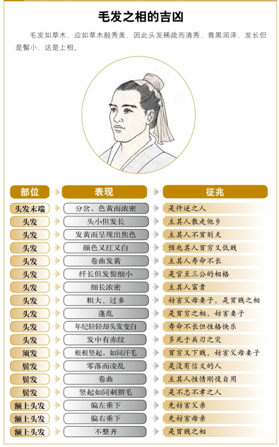 质地粗硬者,为毛。身体的任何一个部位长毛,都为贫贱之相。又细又软者,为毫。腿脚上长有毫,为奇相。肚脐下、谷道上都长毛的人,一生都不会为阴病所缠身。这样的人胆子大,从不惧怕神鬼之类的东西。胸部长毛的人,性子急,脾气暴躁。背上长毛的人,一生劳碌辛苦。乳房上长毛(最好长三根)的人,生下的一定是贵子。乳房上的毛像草一样又乱又多的人,命中没有儿子。手指上长毫,也为好相。总之,毫以软为吉。