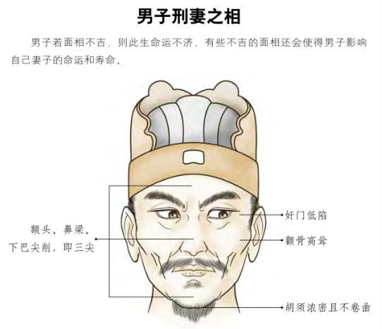 天仓部位所生的皱纹,被称为开库纹。生有此纹的人,五个妻子都会被克死。胡须很多,鼻子很小。胡须浓密,不卷曲。颧骨高高耸起。天仓部位低陷。山根折断。鱼尾低陷。面孔像罗汉和判官一样古怪。鼻梁、下巴、额头狭窄尖削,即三尖;六府削弱单薄,即六削。奸门部位深陷。长有很深的鱼尾纹。鱼尾部位有一道纹,就克一位妻子。