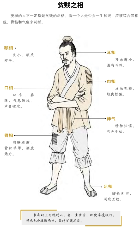 有诗说:贫贱之人在相貌上的特征为:鼻子仰起来,没有鼻梁,牙齿外露,腹部干疱得跟雀腹一样,眉毛经常攒动,额头经常紧蹙,头发较乱,脸上表现出很愁苦的样子。背脊下陷得如同一个坑,胸部瘦得露出了骨头。乳头又细又小跟针头一样,额头尖得像是黄瓜一样。腰肢很粗,臂部外露,眉毛很浓,都压住了眼睛。身体又粗又壮实,显现出黑色,脸上长满了如花一样的麻子和斑痣。还没有开口说话,口水就已经先流出来了,膝盖蜷缩着,眼眉卓立,走路身体欹斜。嘴巴撮起来的时候就像是在吹火,平时喜欢掉臂摇头,还总是发出叹息声。目、鼻、口、耳等四水部位反倾,没精打彩,看上去好像很困乏的样子。